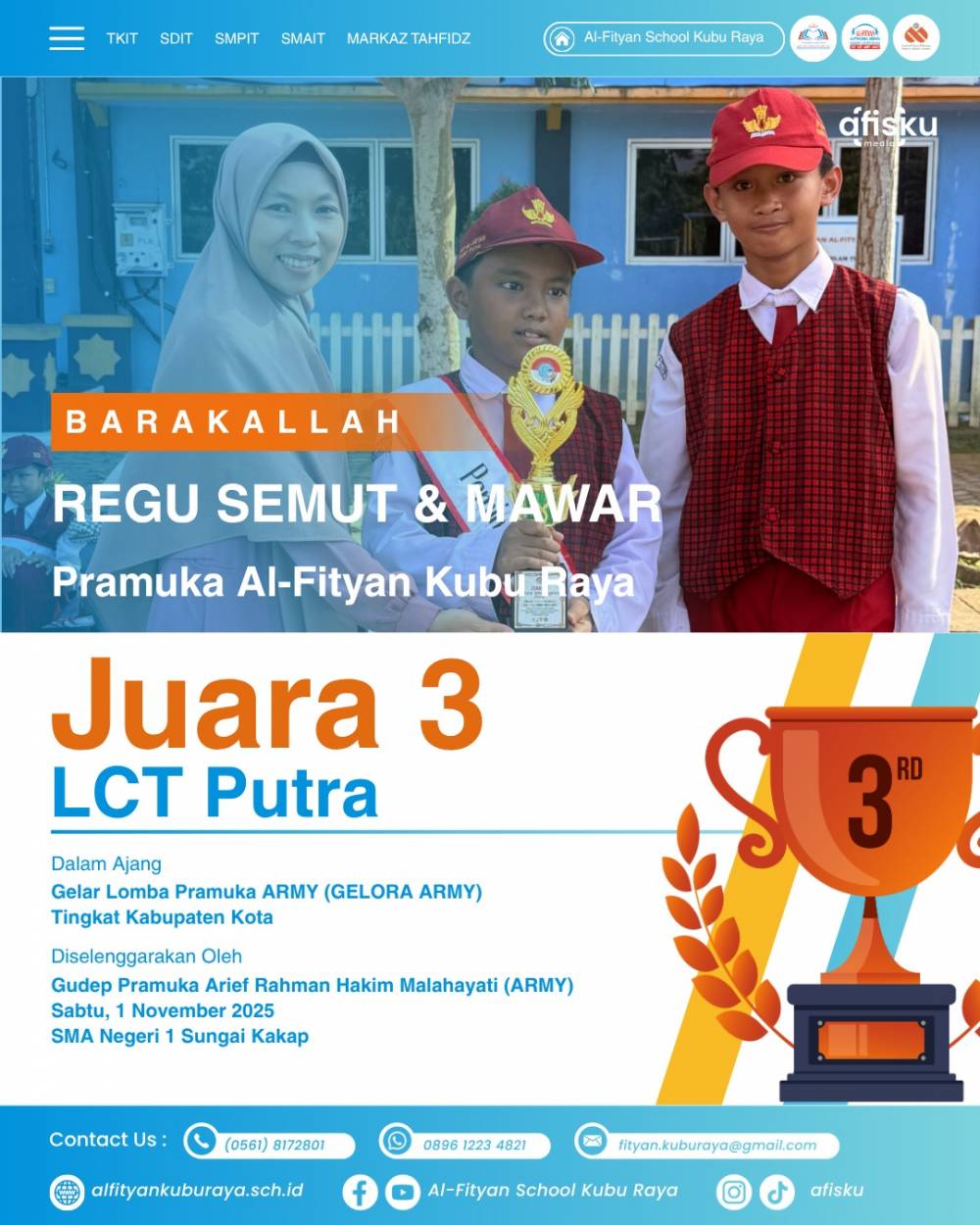 Barakallah Regu semut dan mawar dari SDIT Al-Fityan Kubu Raya berhasil meraih juara 3 Lomba LCT Putra dalam ajang Gelar Lomba Pramuka Army (Gelora Army) Tingkat Kebupaten Kota yang di selenggarakan oleh Gudep Pramuka Arief Rahman Hakim Malahayani (ARMY), Sabtu ,1 November 2025 SMA Negeri 1 Sungai Kakap.