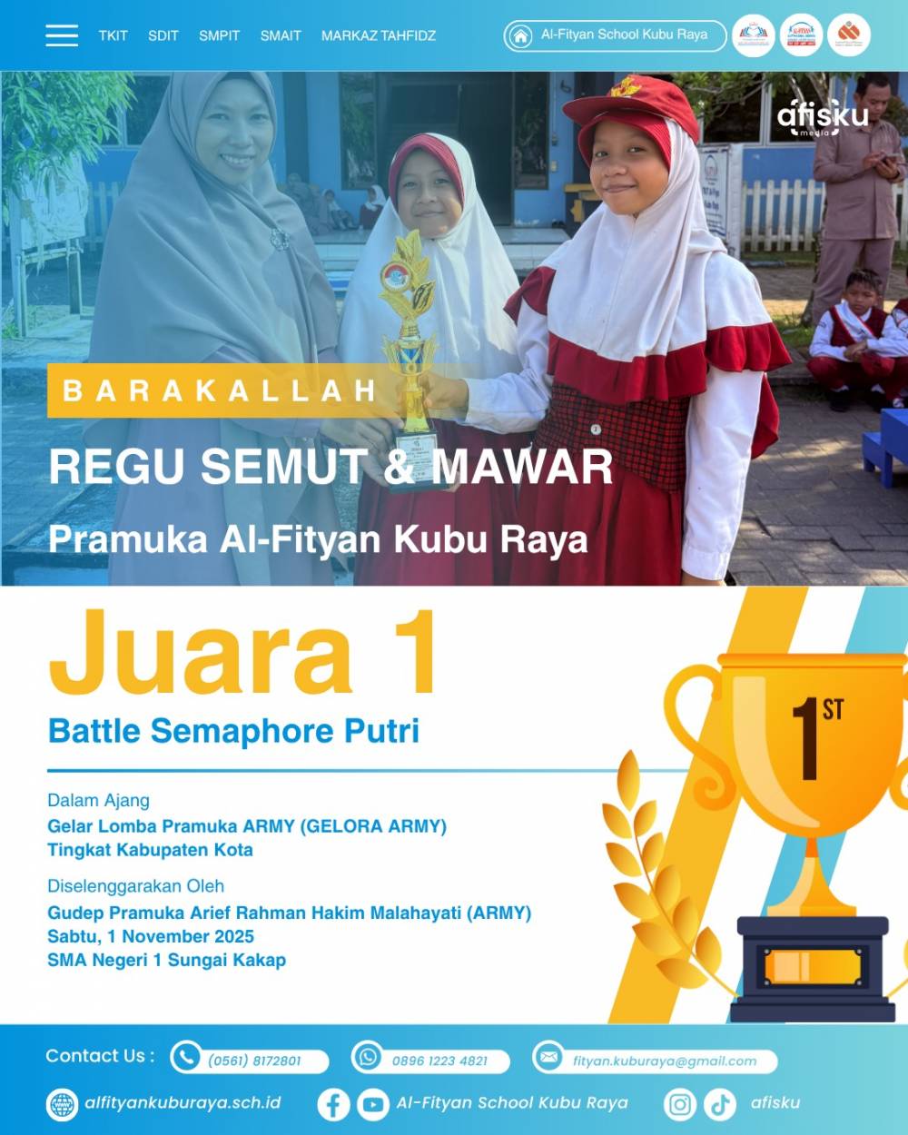 Barakallah Regu semut dan mawar berhasil meraih juara 1 Lomba Battle Semaphore Putri dalam ajang Gelar Lomba Pramuka Army (Gelora Army) Tingkat Kebupaten Kota yang di selenggarakan oleh Gudep Pramuka Arief Rahman Hakim Malahayani (ARMY), Sabtu ,1 November 2025 SMA Negeri 1 Sungai Kakap.
