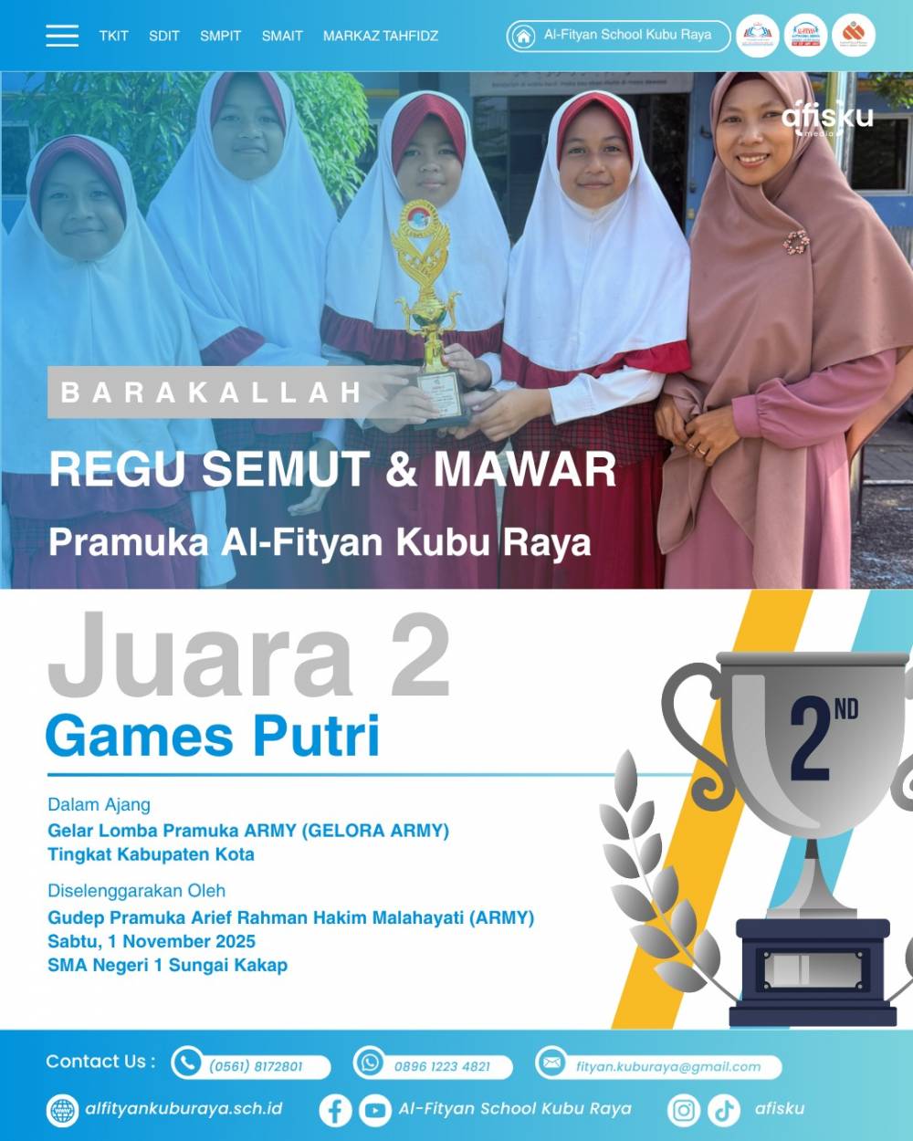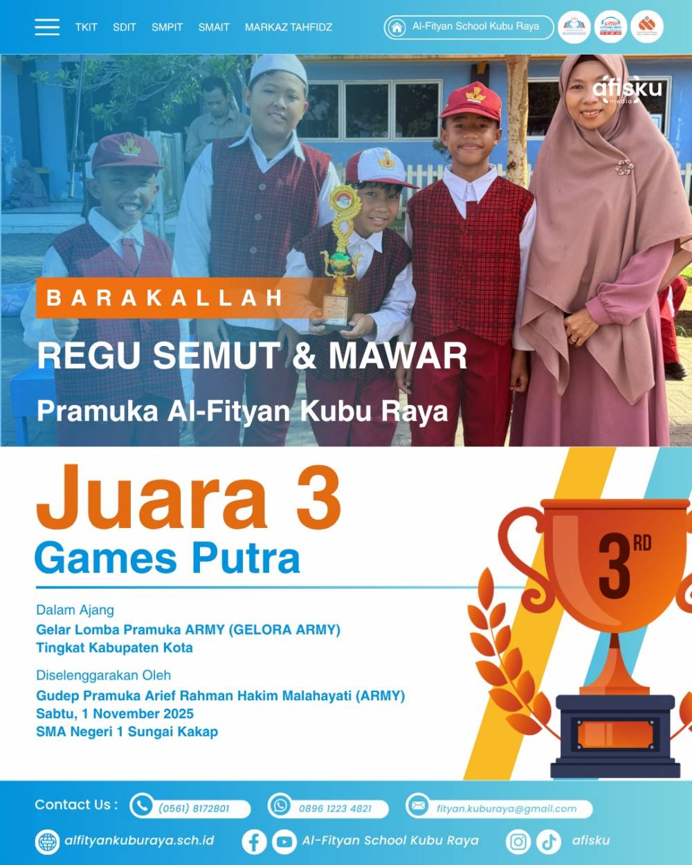 Barakallah Regu semut dan mawar dari SDIT Al-Fityan Kubu Raya berhasil meraih juara 3 Lomba Game Putra dalam ajang Gelar Lomba Pramuka Army (Gelora Army) Tingkat Kebupaten Kota yang di selenggarakan oleh Gudep Pramuka Arief Rahman Hakim Malahayani (ARMY), Sabtu ,1 November 2025 SMA Negeri 1 Sungai Kakap.