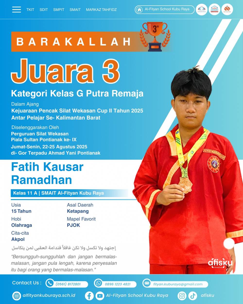 Fatih Kausar Ramdhan SMAIT Al-fityan Kubu Raya berhasil mendapatkan juara 3 pencak silat Kelas G Putra Remaja dalam ajang kejuaraan Pencak Silat Wekasan Cup 2 tahun 2025 antar pelajar se-Kalimantan Barat.