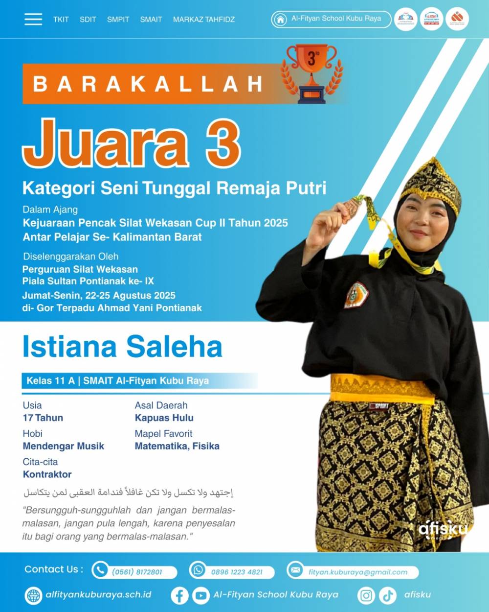 Istiana Saleha SMAIT Al-fityan Kubu Raya berhasil mendapatkan juara 3 pencak silat seni tunggal remaja putri dalam ajang kejuaraan Pencak Silat Wekasan Cup 2 tahun 2025 antar pelajar se-Kalimantan Barat.
