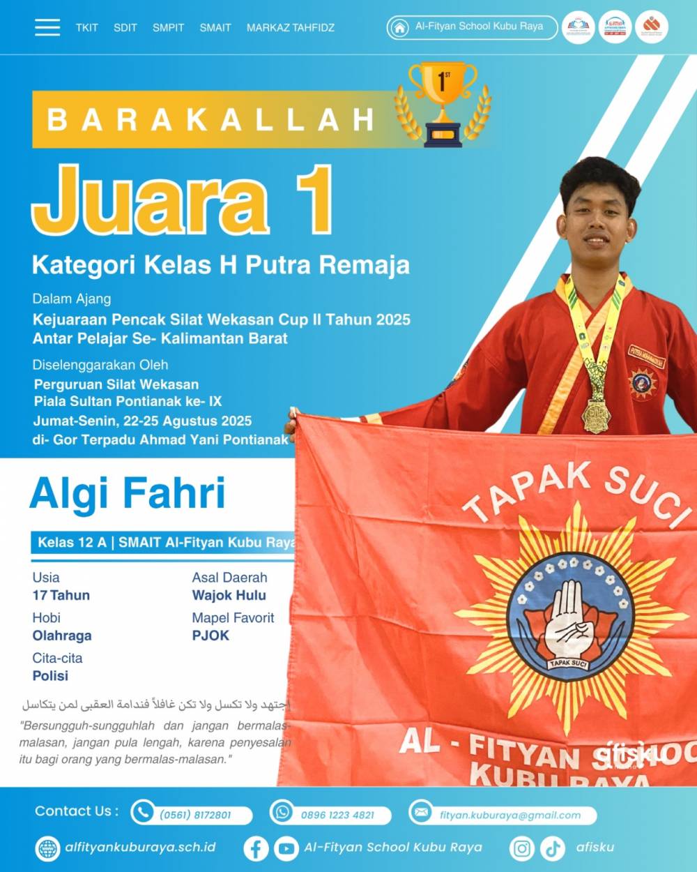 Algi Fahri SMAIT Al-fityan Kubu Raya berhasil mendapatkan juara 1 pencak silat kelas H remaja putra dalam ajang kejuaraan Pencak Silat Wekasan Cup 2 tahun 2025 antar pelajar se-Kalimantan Barat.