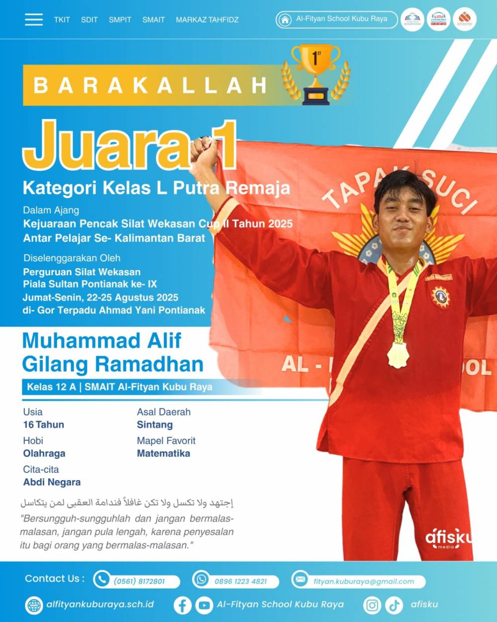 Muhammad Alif Gilang Ramadhan SMAIT Al-fityan Kubu Raya berhasil mendapatkan juara 1 pencak silat kelas L remaja putra dalam ajang kejuaraan Pencak Silat Wekasan Cup 2 tahun 2025 antar pelajar se-Kalimantan Barat.