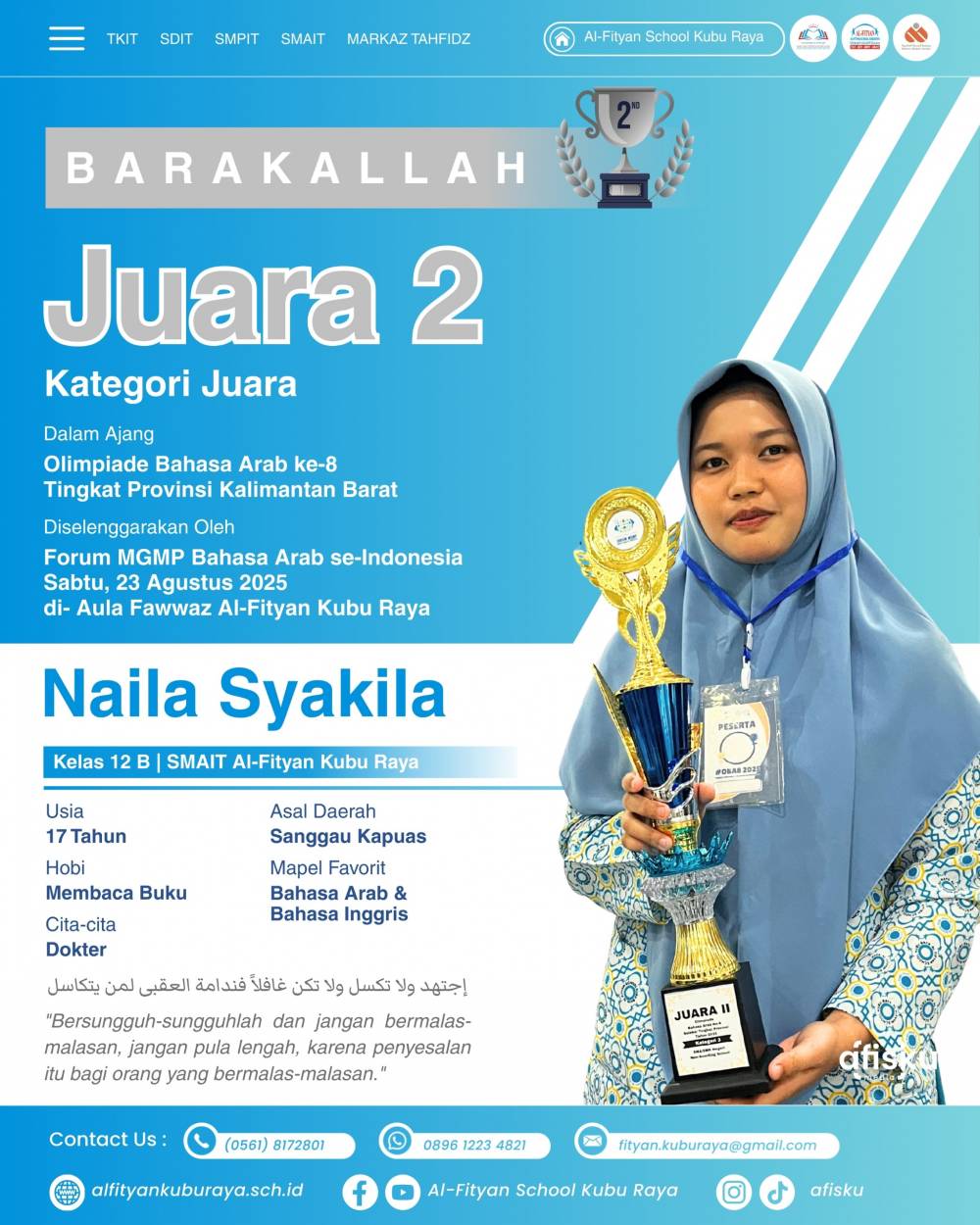 Naila Syakilla asal Sanggau kelas 12 B SMAIT Al-Fityan Kubu Raya mendapatkan Juara 2 Olimpiade Bahasa Arab ke 8 Tingkat Provinsi Kalbar