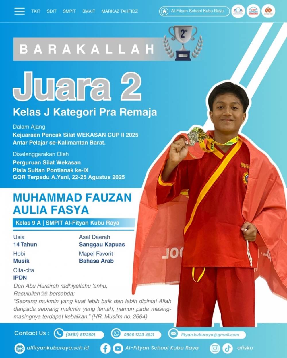 Muhammad Fauzan Aulia Fasya SMPIT Al-fityan Kubu Raya berhasil mendapatkan juara 2 pencak silat kelas j pra remaja putra dalam ajang kejuaraan Pencak Silat Wekasan Cup 2 tahun 2025 antar pelajar se-Kalimantan Barat.