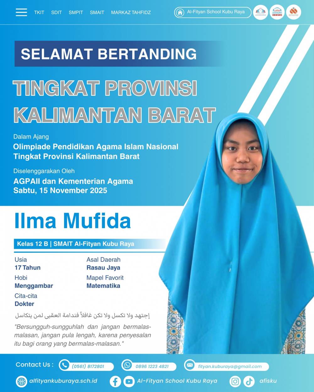 Selamat bertanding Ilma Mufida kelas 12 B SMAIT Al-Fityan Kubu Raya,dalam Olimpiade Pendidikan Agama Islam Nasional Tingkat Provinsi Kal-Bar, yang diselenggarakan oleh AGPAII dan Kementrian Agama, Sabtu,15 November 2025