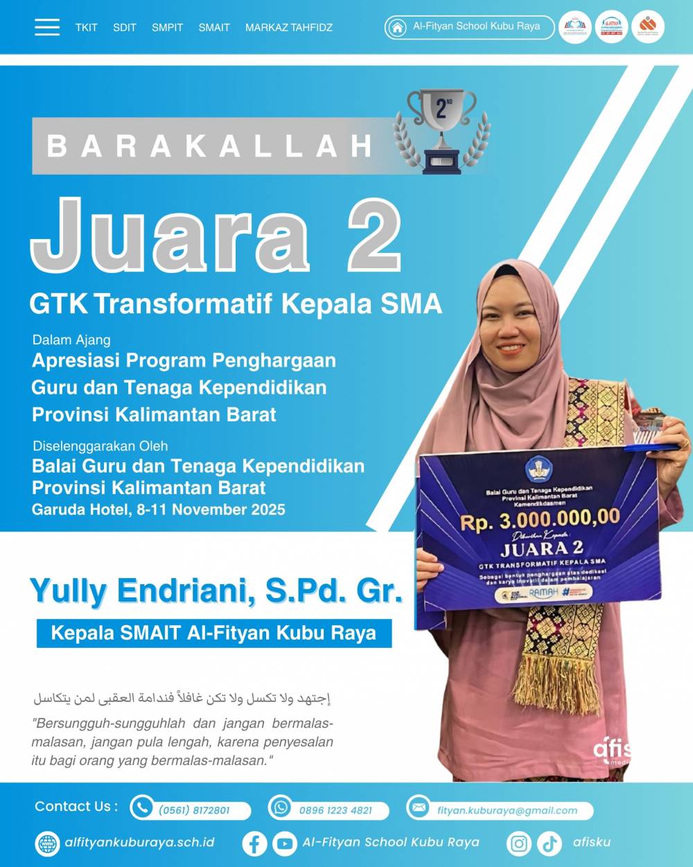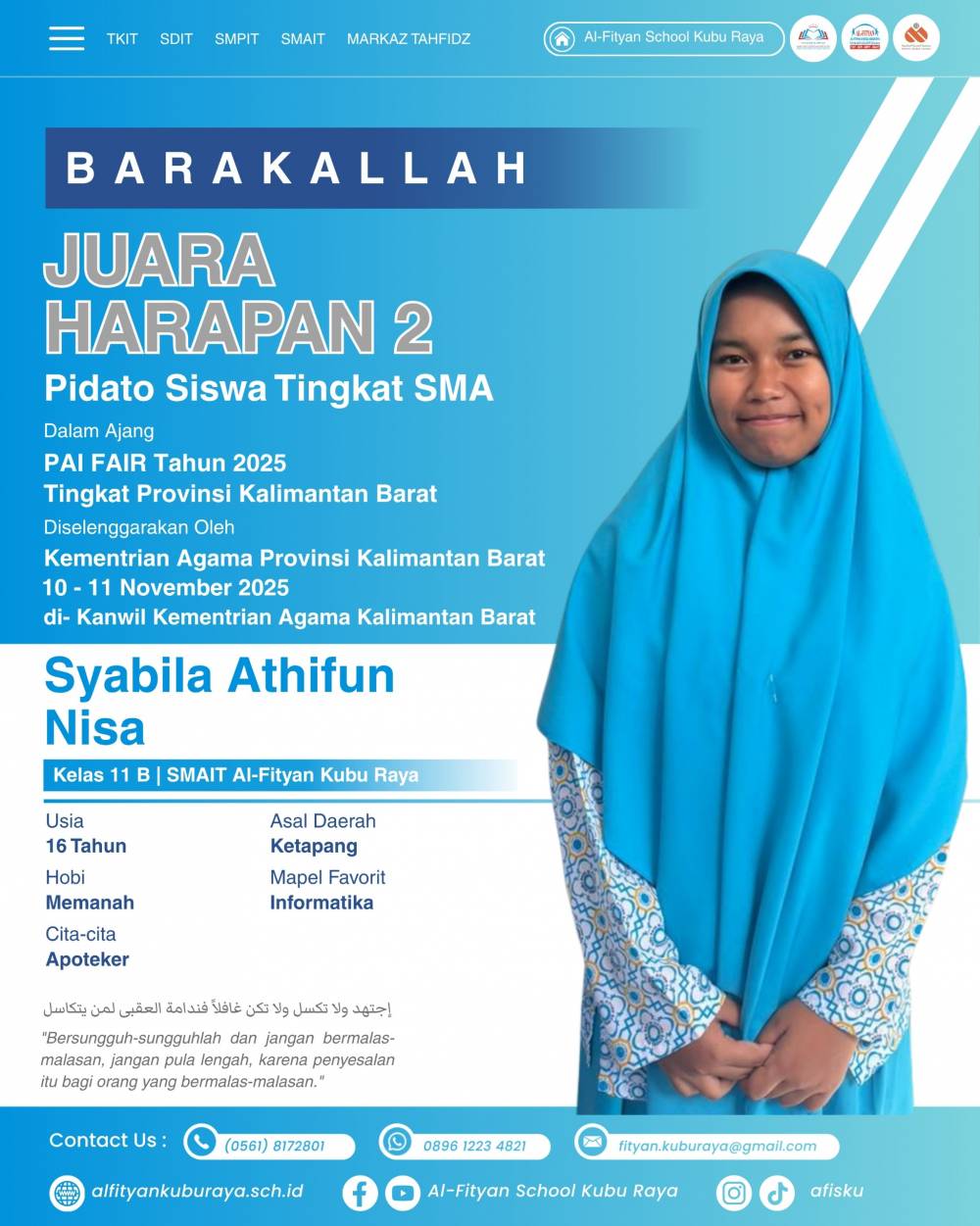 Barakallah Syaibila Athifun Nisa kelas 11B SMAIT Al-Fityan Kubu Raya yang berhasil meraih Juara Harapan 2 Lomba Pidato Tingkat SMA dalam ajang PAI FAIR Kalimantan Barat yang diselenggarakan oleh Kementrian Agama Provinsi Kalimantan Barat 10 - 11 November 2025 di Kanwil Kementrian Agama Kalimantan Barat.