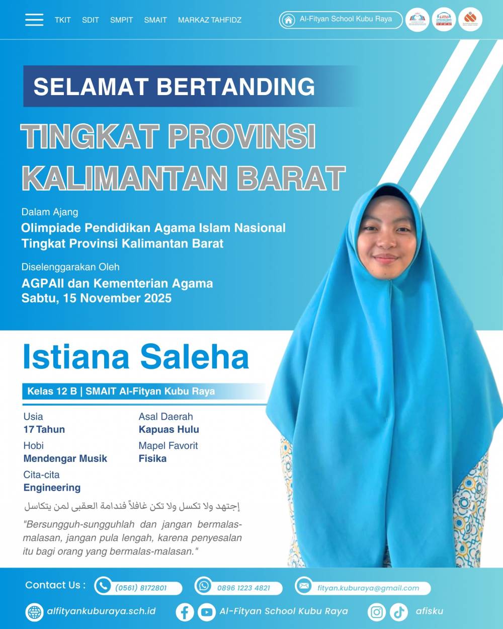 Selamat bertanding Istiana Saleha Kelas 12B SMAIT Al-Fityan Kubu Raya Tingkat Provinsi Kalimantan Barat dalam ajang Olimpiade Pendidikan Agama Islam Nasional Tingkat Provinsi Kalimantan Barat yang diselenggarakan oleh AGPAII dan Kementerian Agama, 15 November 2025.