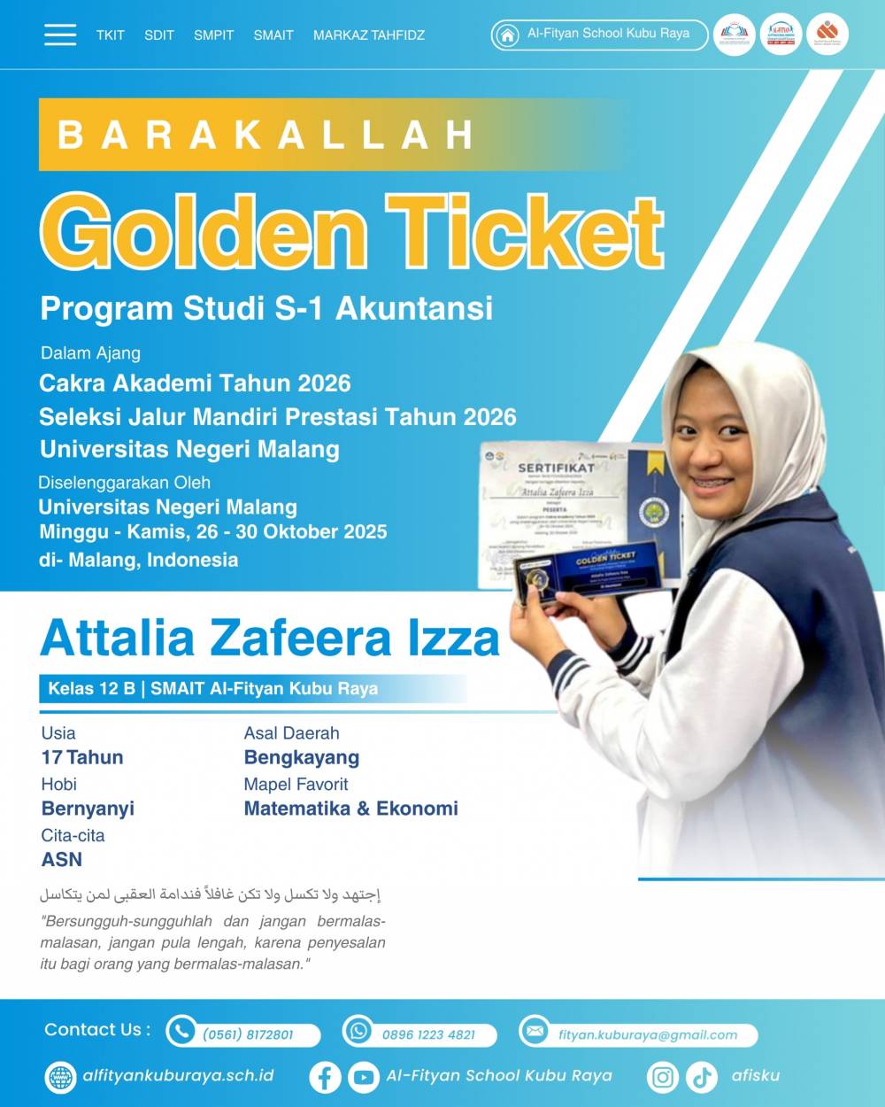 Attalia Zafeera Izza Kelas 12B SMAIT Al-Fityan Kubu Raya berhasil mendapatkan Golden Ticket Program Studi S-1 Akuntansi ,Cakra Akademi Tahun 2026 seleksi jalur mandiri prestasi tahun 2026 Univesitas Negeri Malang.