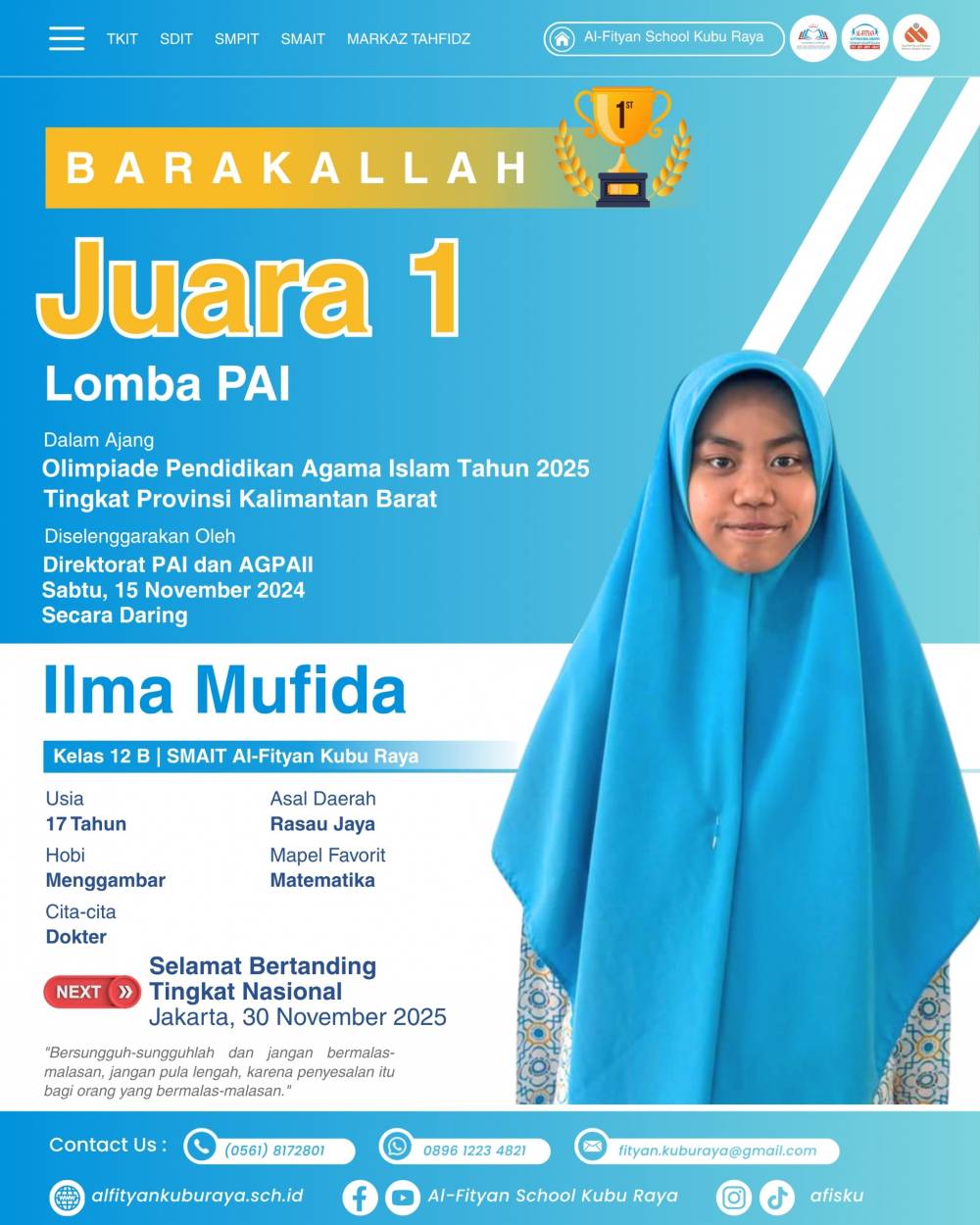 Barakallah kepada Ilma Mufida kelas 12B SMAIT Al-Fityan Kubu Raya telah Berhasil Mendapatkan Juara 1 Lomba PAI dalam Ajang Olimpiade Pendidikan Agama Islam 2025 yang diselanggarakan oleh Direktorat PAI dan AGPII sabtu,15 November 2025 secara daring.