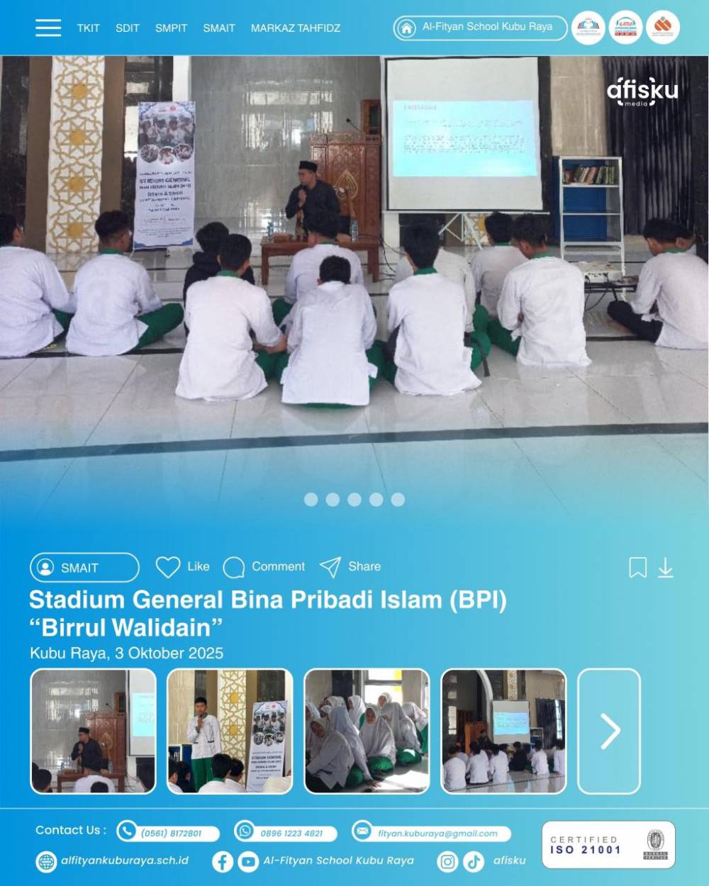 Pada hari Jumat, 3 Oktober 2025, SMAIT Al-Fityan Kubu Raya menyelenggarakan kegiatan Stadium General Bina Pribadi Islam (BPI) yang penuh makna dan inspirasi. Seluruh siswa dan siswi SMAIT Al-Fityan dengan antusias mengikuti kegiatan ini sebagai bagian dari upaya memperkuat pembinaan karakter Islami di lingkungan sekolah.