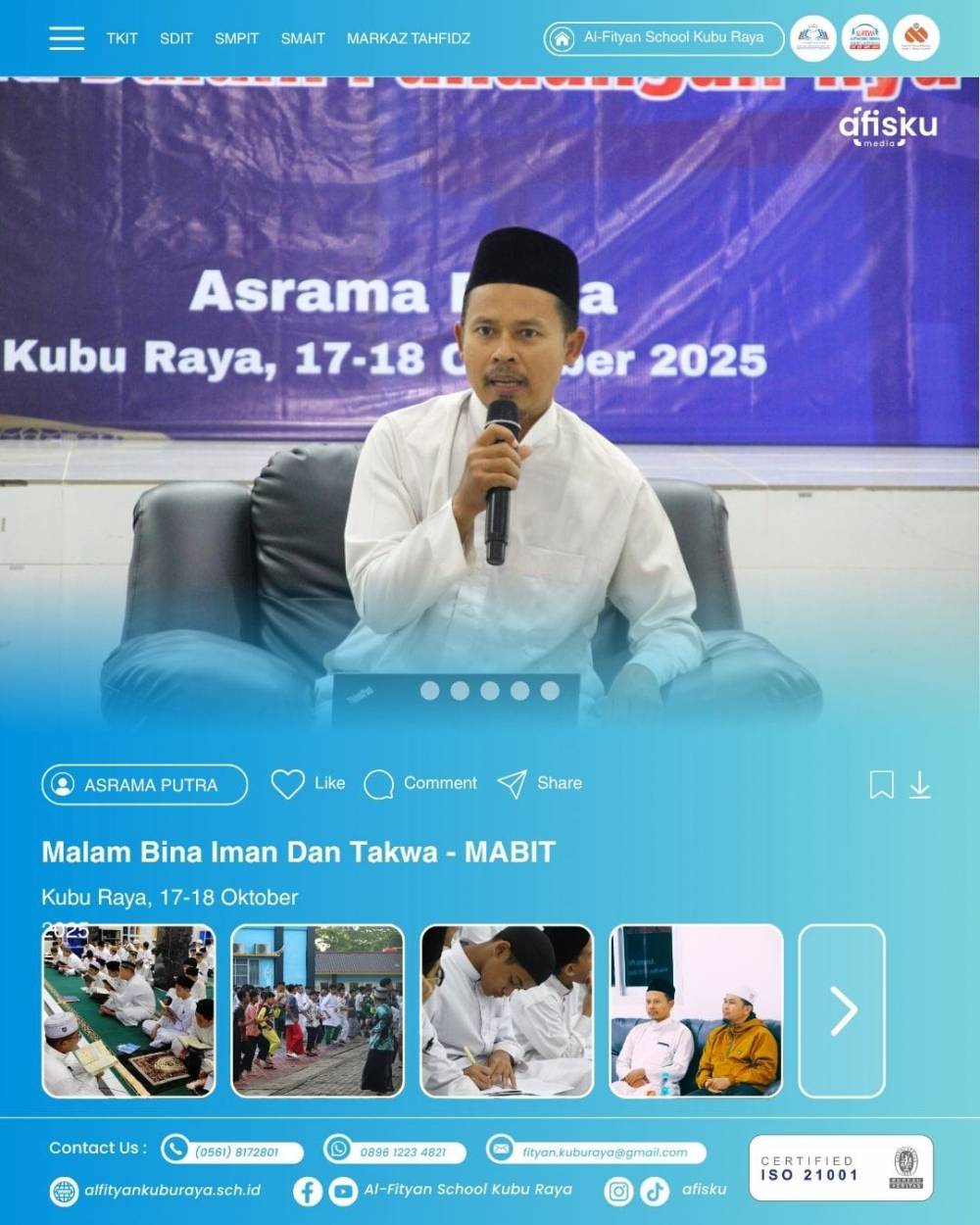 Pada hari Jum’at hingga Sabtu, tanggal *17-18 Oktober 2025, Asrama Putra **Al-Fityan Kubu Raya* mengadakan kegiatan *Mabit (Malam Bina Iman dan Taqwa)*. Kegiatan ini diikuti oleh seluruh siswa asrama dengan penuh semangat dan kebersamaan. Acara diawali pada malam Jum’at dengan shalat berjamaah, tilawah Al-Qur’an, serta dzikir bersama. Suasana asrama terasa khusyuk, para siswa duduk berbaris rapi membaca bersama ayat-ayat suci Al-Qur’an. Memasuki inti acara, hadir pemateri utama yaitu *Ustadz Syaiful Ma'arif* yang membawakan tema “Dalam Pandangan-NYA”. Dalam penyampaiannya, beliau mengingatkan bahwa Tema "Dalam Pandangan-NYA" bertujuan membentuk karakter santri/siswa yang memiliki kualitas iman dan perilaku yang konsisten, baik di depan umum maupun saat tersembunyi, karena segala tindakannya didasarkan pada kesadaran akan pengawasan abadi dari Allah SWT. Ustadz Syaiful Ma'arif juga memberikan motivasi agar para siswa senantiasa menjaga keikhlasan,bersyukur adab, serta perilaku baik, meskipun dalam keadaan tersembunyi. Pada hari Sabtu pagi, kegiatan dilanjutkan dengan shalat tahajud, di lanjutkan dengan coffee break lalu agenda terakhir melaksanakan senam bersama-sama Siswa Dan musryif. Kegiatan ditutup dengan doa bersama, sarapan sederhana, dan saling memberi semangat untuk terus meningkatkan kualitas iman dan taqwa. Mabit ini menjadi pengalaman berharga bagi para siswa, menanamkan rasa yakin bahwa *Selalu Dalam Pandangan-Nya*.