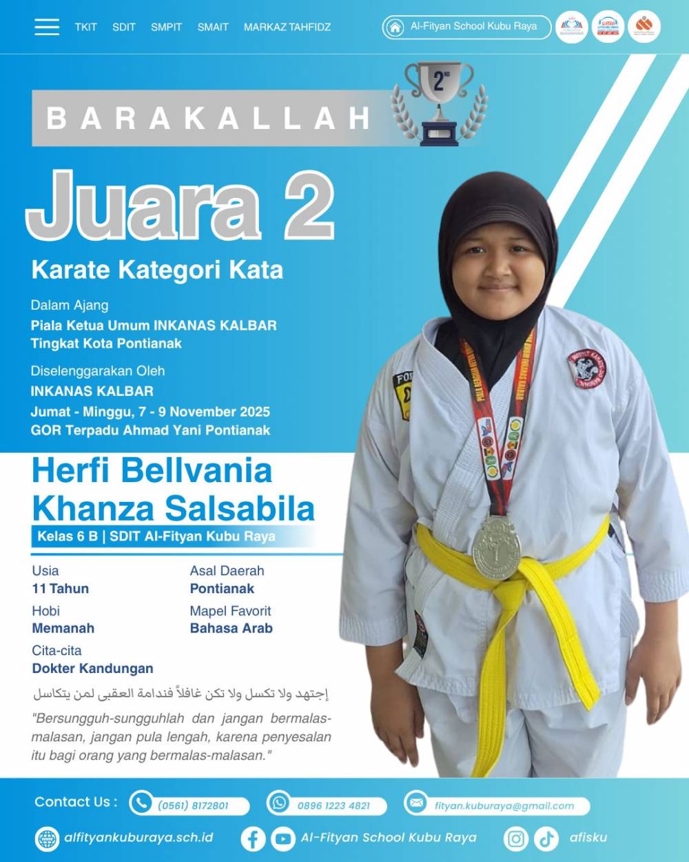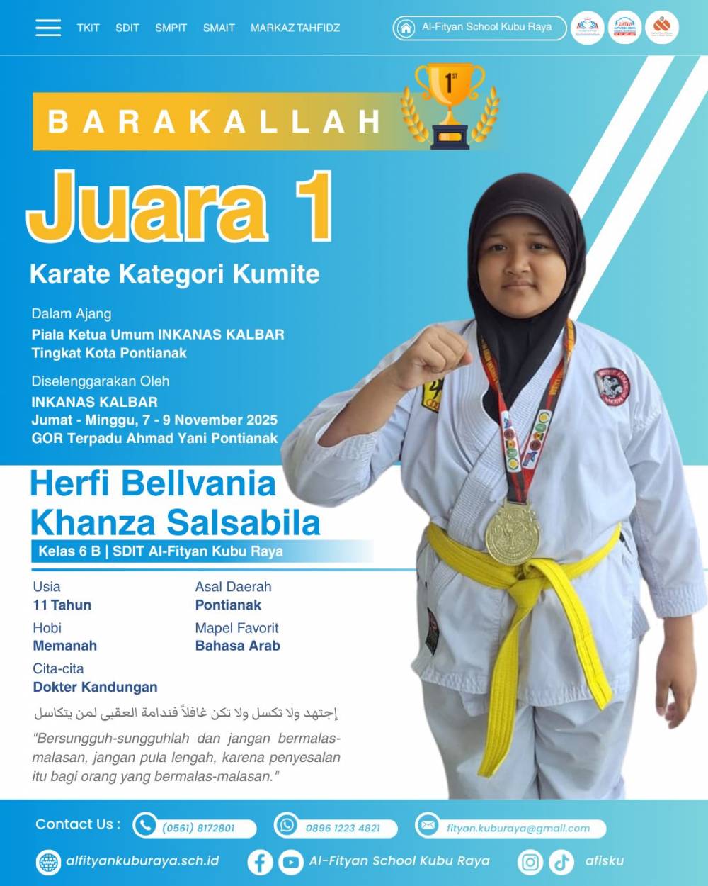 Herfi Bellvania Khanza Salsabila kelas 6B SDIT Al-Fityan Kubu Raya Berhasil Meraih Juara 1 karate kategori Kumite dalam ajang Piala Ketua Umum INKANAS KALBAR Tingkat Kota Pontianak. Diselenggarakan Oleh INKANAS KALBAR, Jumat - Minggu,7- 9 November 2025 di Gor Terpadu Ahmad Yani Pontianak.